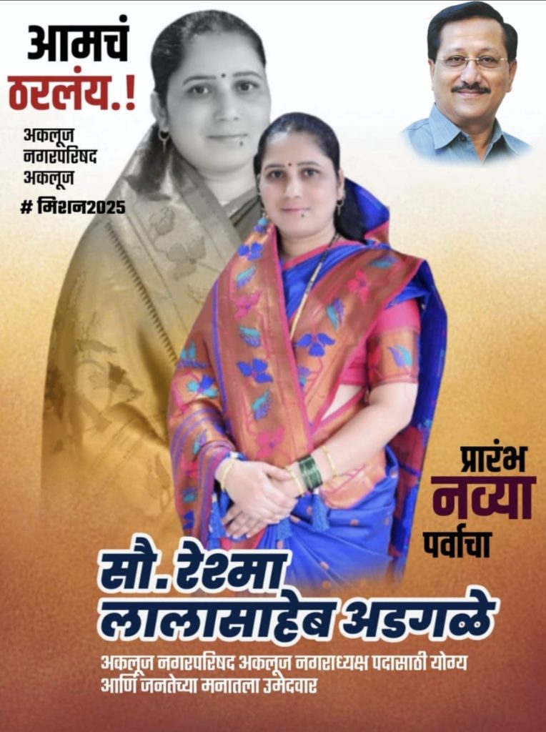 अकलूज नगरपरिषदेच्या नगराध्यक्ष पदासाठी मोहिते पाटील परिवाराचे कट्टर समर्थक मातंग समाजाचे नेतृत्व श्री लालासाहेब अडगळे यांच्या पत्नी सौ.रेश्मा लालासाहेब अडगळे यांचे नाव सद्या अकलूज परिसरात नगराध्यक्ष पदासाठी जवळ जवळ निश्चित झालेले आहे असेच वाटत असताना अकलूज मधील संपूर्ण मातंग समाजाने ही आपल्या समाजाचा उमेदवार म्हणून सौ. रेश्मा लालासाहेब अडगळे यांना जाहीर पाठिंबा दिला आहे ,